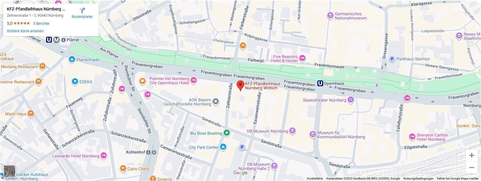 Damit wir Ihr Fahrzeug prüfen können, bringen Sie es in unser Kfz-Leihhaus Nürnberg. Unser Standort befindet sich zentral gelegen in der Nähe vom Hauptbahnhof. Ist das Fahrzeug in Ordnung und das Darlehen vereinbart, erhalten Sie Ihre Auszahlung schon innerhalb einer Stunde. Haben Sie keine Zeit, selbst zu uns zu kommen, bieten wir als besondere Leistung für unsere Kunden einen bundesweiten Hol- und Bringservice zum Pfandhaus für Autos aller Art an.