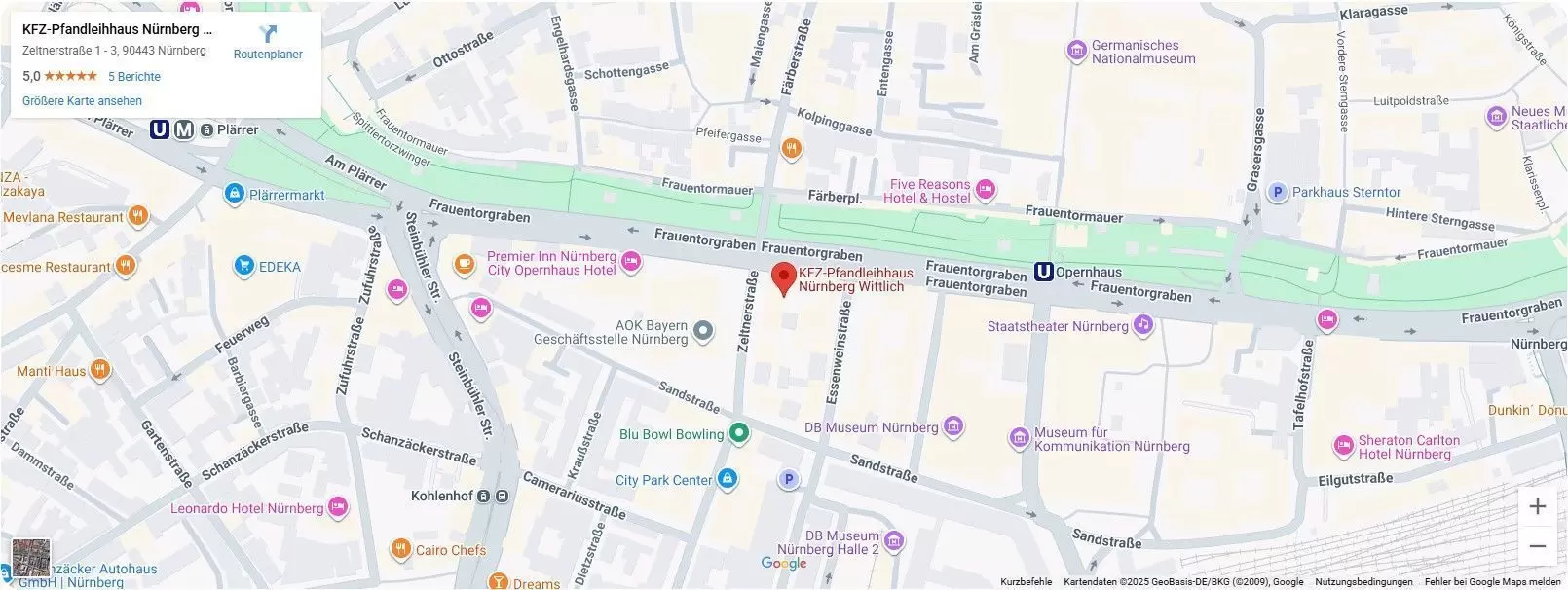 Unser Kfz-Pfandkredithaus in Nürnberg ist zentral gelegen und gut erreichbar – ideal für Kunden aus allen Stadtteilen. Wir bieten schnelle, diskrete und faire Lösungen, wenn kurzfristig finanzielle Mittel benötigt werden. Unsere Leistungen stehen Ihnen in folgenden Nürnberger Stadtgebieten zur Verfügung: St. Johannis, Gostenhof, Langwasser, Mögeldorf & Ziegelstein.