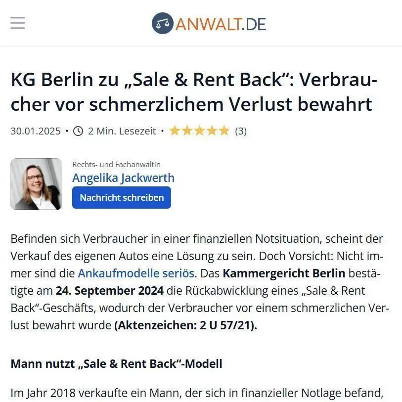 In einem vielbeachteten Fall vor dem Oberlandesgericht Frankfurt wurde einem Anbieter untersagt, das Fahrzeug einer Kundin im Rahmen eines Sale-and-Rent-Back-Modells einzubehalten. Die Frau hatte ihr Auto verkauft und anschließend gegen eine monatliche Gebühr zurückgemietet. Laut Urteil war der Vertrag intransparent, der wirtschaftliche Vorteil eindeutig einseitig – und die Kundin hatte zu keinem Zeitpunkt eine faire Wahl zwischen echten Alternativen.